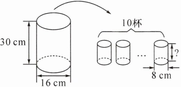 10. 好朋友给小亮过生日,如图,现有底面直径为 16 cm,高为 30 cm 的圆柱形容器,里面装满了果汁,小亮要把果汁分装到底面直径为 8 cm 的 10 个小圆柱形杯子里(每个杯子刚好装满),与好友分享,则杯子的高度为