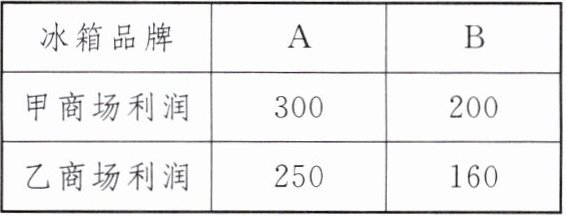 9. 某企业采购了A品牌冰箱40台,B品牌冰箱60台,准备让旗下的甲、乙两家商场卖出,其中70台给甲商场,30台给乙商场.设企业调配给甲商场$x$($x$为正整数)台A品牌冰箱.两家商场销售这两种品牌冰箱每台的利润如下表(单位:元):