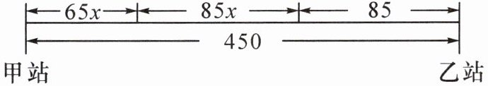 2. 甲、乙两站间的路程为450千米,一列慢车从甲站开出,每小时行驶65千米,一列快车从乙站开出,每小时行驶85千米。快车先开1小时,两车相向而行,慢车行驶多少小时后两车相遇?