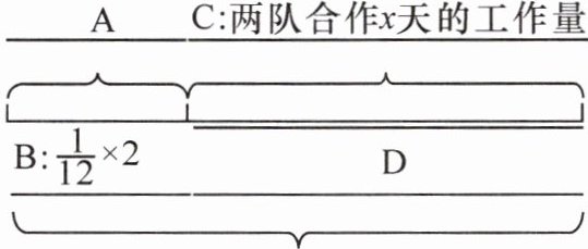 7. 一道条件缺失的问题情境:一项工程,甲队单独做需要12天完成……还需要几天完成任务。根据标准答案,老师在黑板上画出线段示意图(如图),设两队合作还需x天完成任务,并列方程为$\frac{1}{12}×2 + (\frac{1}{8} + \frac{1}{12})x = 1$。根据以上信息,下列结论中不正确的是(