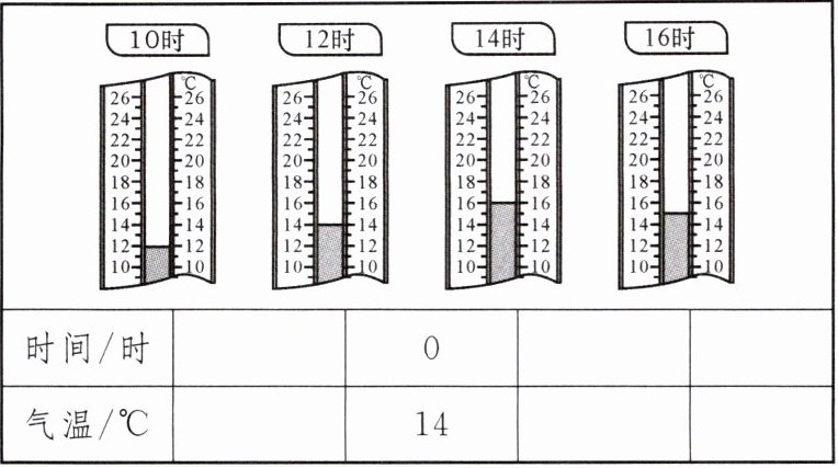 15. 某天10时、12时、14时、16时的气温如图所示.记12时的时间为0,12时以后的时间为正,请用正数和负数表示余下的三个时间及其气温,并填入下表.