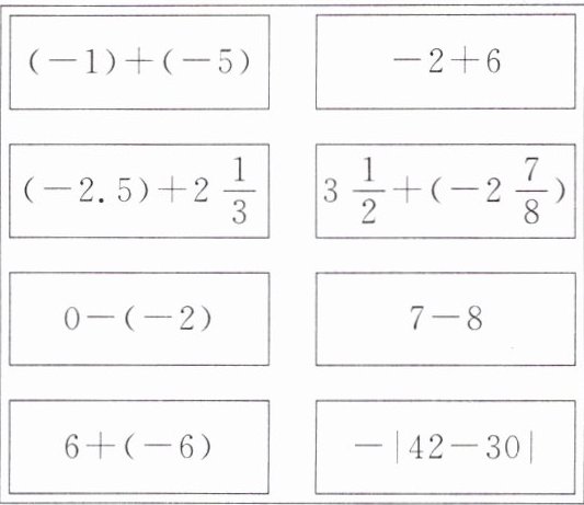 15.解:由题意,得(-1)+(-5)=-6<0,$(-2.5)+2\frac{1}{3}=-\frac{1}{6}<0$,0-(-2)=2>$0,6+(-6)=0,-2+6=4>0,3\frac{1}{2}+(-2\frac{7}{8})=\frac{5}{8}>0,7-8=-1<0,-$|42-30|=-12<0.