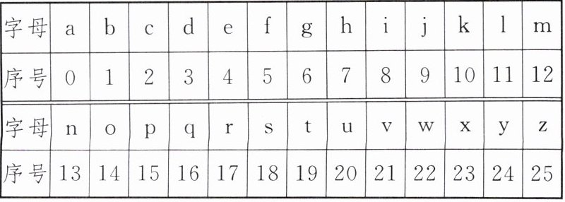 4.(教材 P99 习题 T4 变式)有一种密码,将 26 个英文字母 a,b,c,…,z 不论大小写依次对应 0,1,2,3,…,25 这 26 个自然数(如表格),当明码对应的序号 $ x $ 为奇数时,密码对应的序号为 $ \frac{|x - 33|}{2} $;当明码对应的序号 $ x $ 为偶数时,密码对应的序号为 $ \frac{x}{2}+5 $。按上述规定,将明码“efuz”译成密码是