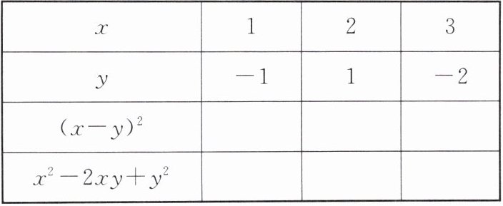 5. (1) 根据表中所给的 $x$,$y$ 的值,计算 $(x - y)^{2}$ 与 $x^{2} - 2xy + y^{2}$ 的值,并将计算结果填入表中: