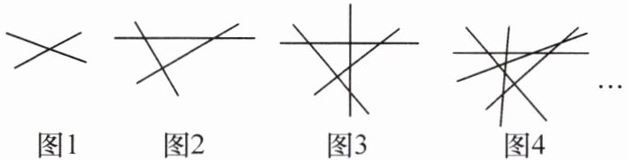 17. 我们知道,两条直线相交,最多有1个交点(如图1);三条直线两两相交,最多有3个交点(如图2);四条直线两两相交,最多有多少个交点(如图3);五条直线两两相交,最多有多少个交点(如图4);六条直线两两相交,最多有多少个交点……n条直线两两相交,最多有多少个交点呢(用含n的代数式表示):