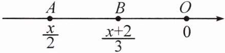 9. 如图,$A$,$B$为数轴上的两点,$O$为原点,点$A$,$B表示的数分别是\frac{x}{2}$,$\frac{x + 2}{3}$。若$B$,$O两点之间的距离等于A$,$B$两点之间的距离,则$x$的值是