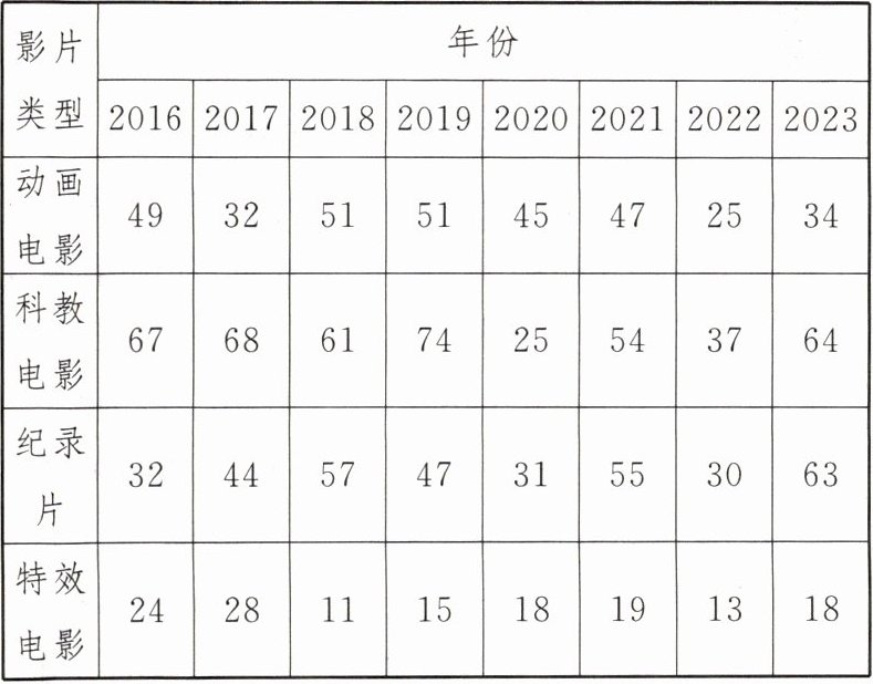 4. 下表统计了 2016-2023 年四种类型电影的生产量.