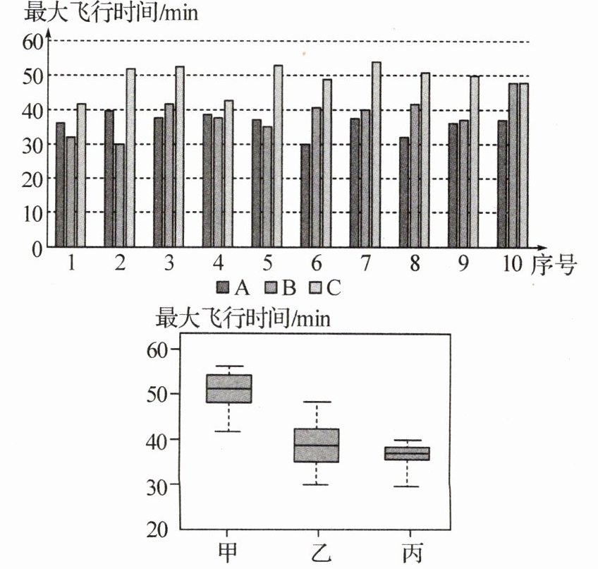 9. 小红为了解A,B,C三款品质相近的无人机在一次充满电后运行的最长时间,分别随机调查了A,B,C三款无人机各10架,记录它们运行的最长时间(单位:min),并对数据进行整理,绘制了两张统计图,但是在绘制统计图时小红不小心弄混了箱线图分别对应哪款无人机,请分辨出乙无人机对应