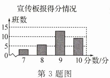 3. (2024·河南)2024年3月是第8个全国近视防控宣传教育月,其主题是“有效减少近视发生,共同守护光明未来”.某校组织各班围绕这个主题开展板报宣传活动,并对各班的宣传板报进行评分(满分10分),得分情况如图所示,则得分的众数为