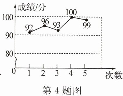 4. (2024·淄博)数学兴趣小组成员小刚对自己的学习质量进行了测试.如图,这是他最近五次测试成绩(满分为100分)的折线统计图,那么其平均数和方差分别是(