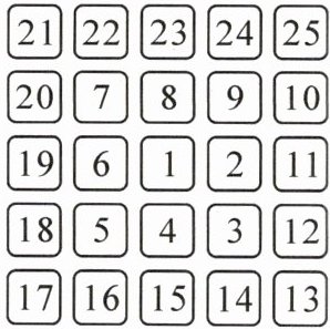 7. 将标有 $1\sim25$ 号的 25 个座位按如图所示的方式摆放. 甲、乙、丙、丁四人玩选座位游戏,甲选 2 个座位,乙选 3 个座位,丙选 4 个座位,丁选 5 个座位. 游戏规则如下: