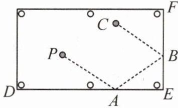 14. 如图,台球运动中,母球$P击中桌边上的点A$,经桌边反弹后击中相邻桌边上的点$B$,再次反弹(提示:$∠PAD= ∠BAE$,$∠ABE= ∠CBF$,$∠AEB= 90^{\circ}$)。