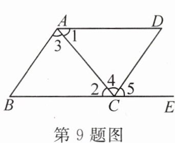 9. 如图,下列条件:①$∠B+∠BCD= 180^{\circ}$;②$∠1= ∠2$;③$∠3= ∠4$;④$∠B= ∠5$;⑤$∠3= ∠5$。其中能判定$AB// CD$的是(
