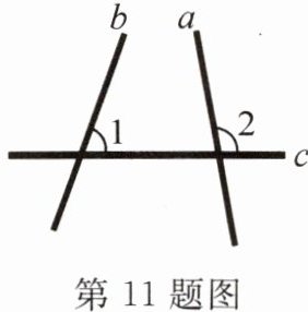 11. 如图,将$a$,$b$,$c$三根木棒钉在一起,$∠1= 70^{\circ}$,$∠2= 100^{\circ}$。现将木棒$c$固定,木棒$a$,$b同时分别以17^{\circ}/s和2^{\circ}/s$的速度沿顺时针方向旋转。当木棒$a$旋转一周时,两根木棒同时停止旋转,则旋转______