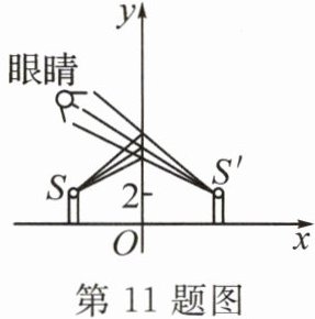 11. 新考向 跨学科 如图,这是蜡烛的平面镜成像的原理图,以桌面为 $ x $ 轴,镜面侧面为 $ y $ 轴(镜面厚度忽略不计)建立平面直角坐标系. 如果某刻火焰顶尖点 S 的坐标是 $ (-4,2) $,那么此时对应的虚像顶尖点 $ S' $ 的坐标是______.