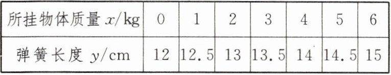 15. 在一定限度内,弹簧挂上物体后会伸长,测得一弹簧长度 $ y(cm) $ 与所挂物体质量 $ x(kg) $ 有如下关系(假设都在弹性限度内):