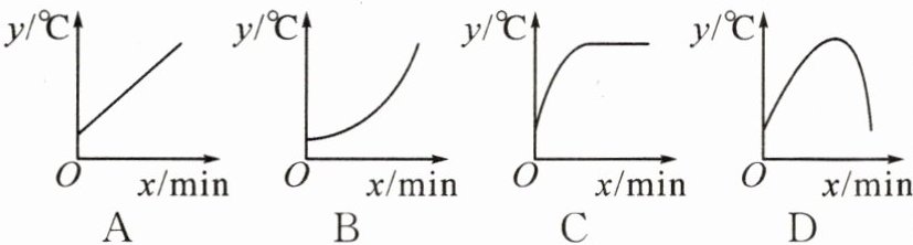 11. (2024·江西)将常温中的温度计插入一杯 $ 60^{\circ}C $ 的热水(恒温)中,温度计的读数 $ y(^{\circ}C) $ 与时间 $ x(min) $ 的关系用图象可近似表示为(