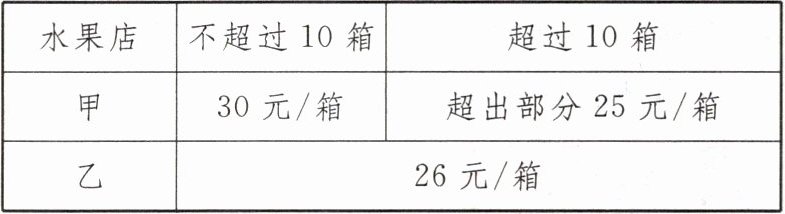 (1)甲水果店:不超过10箱,即当0≤x≤10时,y=30x;超过10箱,即当x>10时,y=30×10+25(x-10)=25x+50,