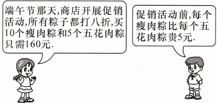 解:设促销活动前每个瘦肉粽、五花肉粽的售价分别为x元、y 元.由题意,得$\left\{\begin{array}{l} 0.8(10x+5y)=160,\\ x-y=5,\end{array}\right. $解得$\left\{\begin{array}{l} x=15,\\ y=10.\end{array}\right. $答:促销活 动前每个瘦肉粽、五花肉粽的售价分别为15元、10元.