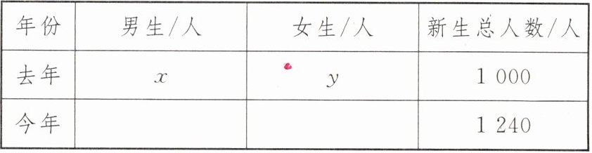 1. 某校去年原计划招收初一新生1000人,今年实际招到初一新生1240人,其中男生超20%,女生超30%。设该校去年计划招收男生x人,招收女生y人。