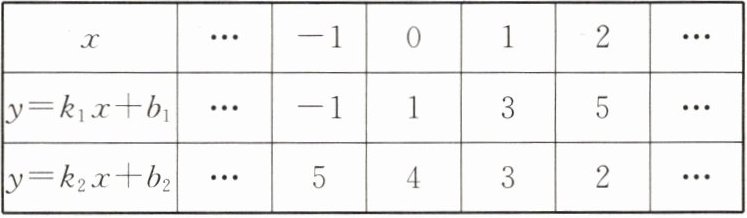 12. 下表是一次函数 $y = k_1x + b_1$ 和 $y = k_2x + b_2$ 图象上一部分点的坐标: