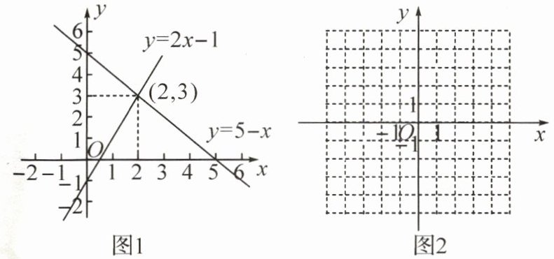 (1) 通过学习我们知道一次函数 $y = 5 - x$ 和 $y = 2x - 1$ 的图象如图 1 所示,所以方程组 $\begin{cases}x + y = 5,\\2x - y = 1\end{cases} $ 的解为