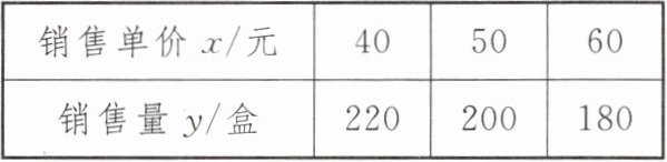 1. 某水果店推出的一款水果拼盘套餐受到了广大消费者的喜爱,每天的销售量 $ y $(盒)与销售单价 $ x $(元)之间存在一次函数关系(如下表所示)。已知该水果拼盘套餐的成本为 30 元/盒。