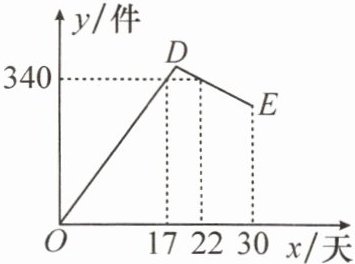 2. 某公司开发出一款新的节能产品,该产品的成本价为 6 元/件。该产品在正式投放市场前通过代销点进行了为期一个月(30 天)的试销售,售价为 8 元/件。工作人员对销售情况进行了跟踪记录,并将记录情况绘成图象(如图所示),图中的折线 $ ODE $ 表示日销售量 $ y $(件)与销售时间 $ x $(天)之间的函数关系。已知线段 $ DE $ 表示的函数关系中时间每增加 1 天,日销售量减少 5 件。