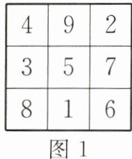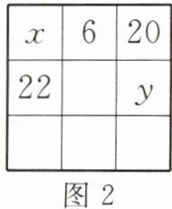 14. 新考向 数学文化 幻方是古老的数学问题,我国古代的《洛书》中记载了最早的幻方——九宫格.将9个数填入幻方的空格中,要求每一横行、每一竖列以及两条对角线上的3个数之和相等,例如图1就是一个幻方.若图2是一个未完成的幻方,则其中$x与y$的和是(