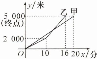 (3)当$10≤x≤16$时,设乙跑的路程y(米)与时间x(分)之间的关系式为$y=kx+b$.将$(10,2000),$$(16,5000)$代入,得$\left\{\begin{array}{l} 10k+b=2000,\\ 16k+b=5000,\end{array}\right. $解得$\left\{\begin{array}{l} k=500,\\ b=-3000.\end{array}\right. $