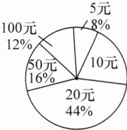 3. 在一次捐款活动中,某班 50 名同学都拿出自己的零花钱,有捐 5 元、10 元、20 元的,还有捐 50 元和 100 元的.如图所示的统计图反映了不同捐款数的人数比例,那么该班同学平均每人捐款(