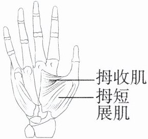 7. (长沙模拟)握手是中华民族一种常见的礼节。握手时,大拇指要向手心运动。如图是人右手掌心面骨骼及部分肌肉示意图。下列叙述正确的是(