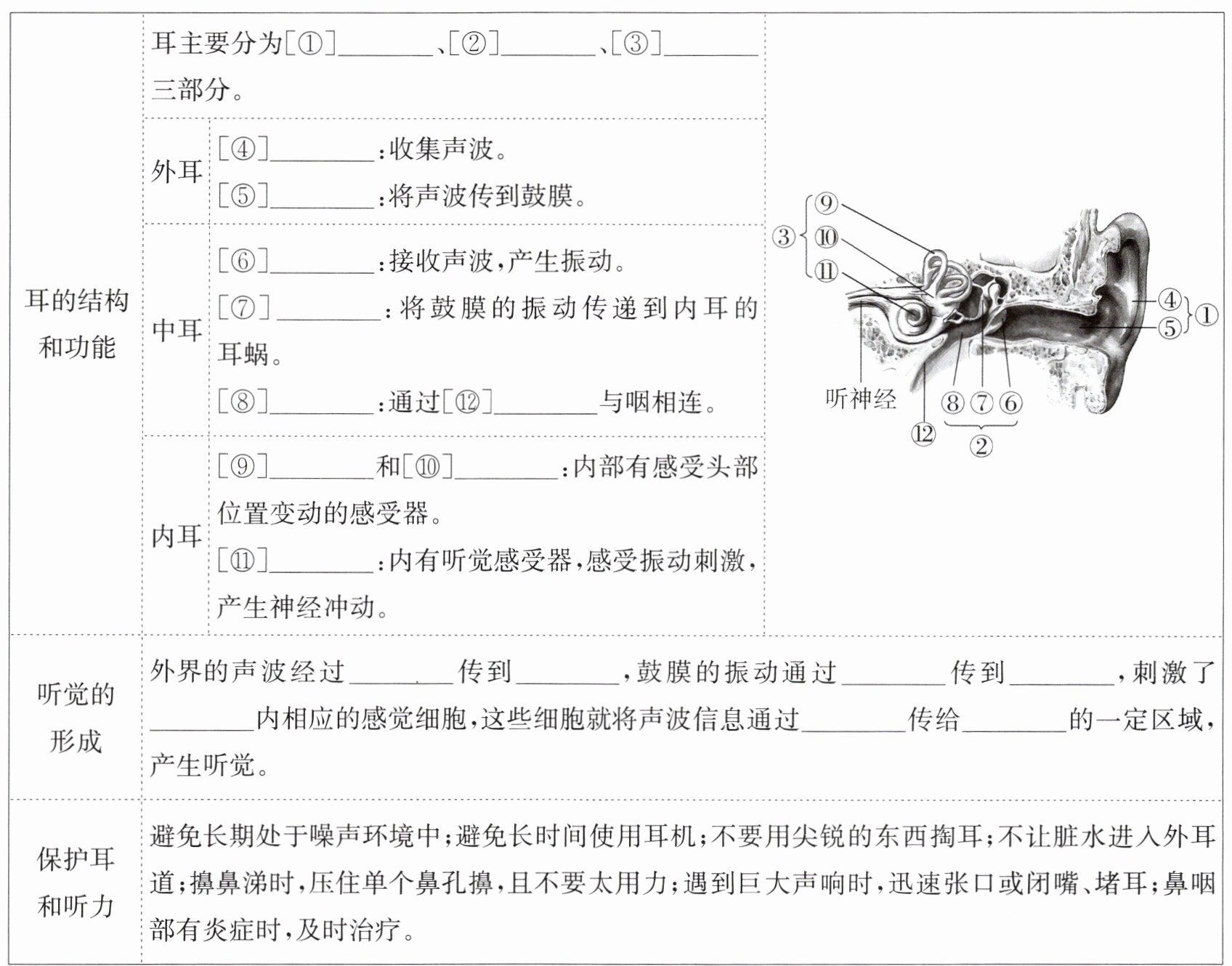 ;其中[⑦]和[⑧]能感受头部位置变动,与维持身体平衡有关;[⑨]内有听觉感受器。5. 听觉的形成过程:外界的声波经过