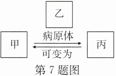 7. 如图,甲、乙、丙表示传染病流行的三个基本环节。下列叙述错误的是(