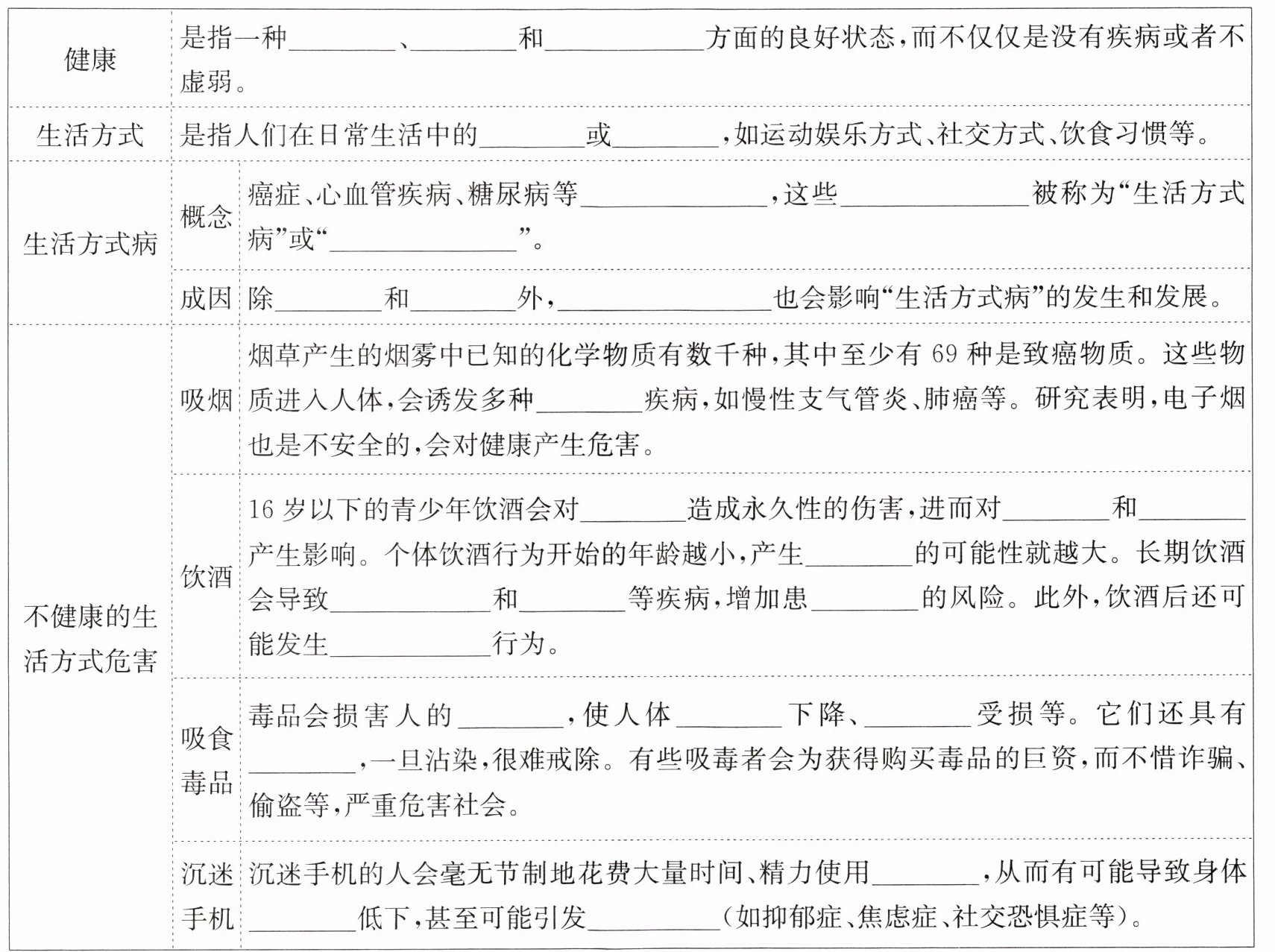 身体上 心理上 社会适应 行为方式 习惯 非传染性疾病 非传染性疾病 现代文明病 遗传因素 环境因素 不健康的生活方式 呼吸系统 大脑 行为 情绪 酒精依赖 心血管疾病 肝病 癌症 违法犯罪 神经系统 免疫功能 心肺 成瘾性 手机 免疫力 精神障碍