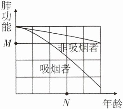 3. (泰安期末)如图表示相同年龄段吸烟者和非吸烟者肺功能随年龄增长的变化曲线。下列叙述错误的是(