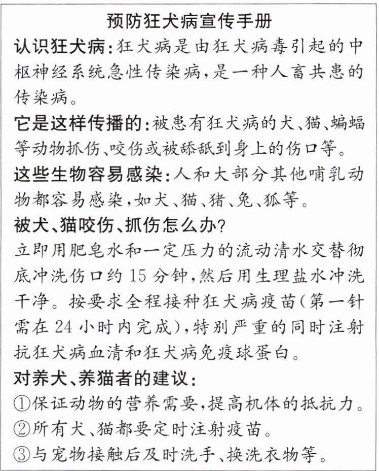 9.(滨州中考节选,★★☆)狂犬病是一种烈性传染病。大力普及狂犬病知识,懂得如何预防狂犬病非常重要。某生物兴趣小组经过查找资料,制作了如下宣传手册。回答相关问题。(10分)