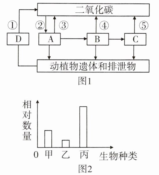 5. 下面两个图,图 1 是某生态系统碳循环和能量流动示意图,图 2 是该生态系统中某些生物的相对数量关系示意图。请据图分析判断下列说法,不正确的是(