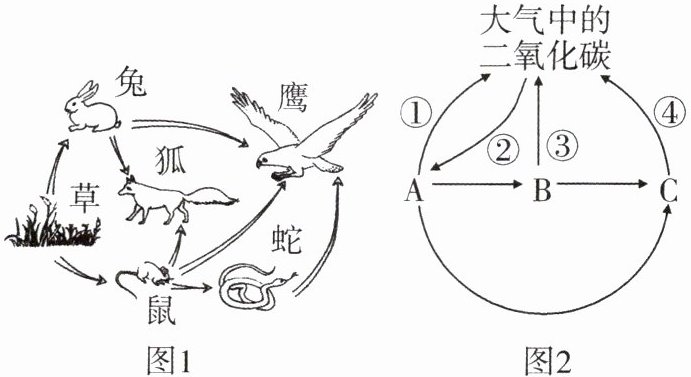 4. (揭阳一模)“美丽的草原,我的家……”这首优美的旋律让人们对美丽的大草原十分向往。如图 1 表示某草原生态系统的食物网,图 2 表示该生态系统的碳循环,其中 A、B、C 为生物成分,①②③④代表生理过程。下列说法错误的是(