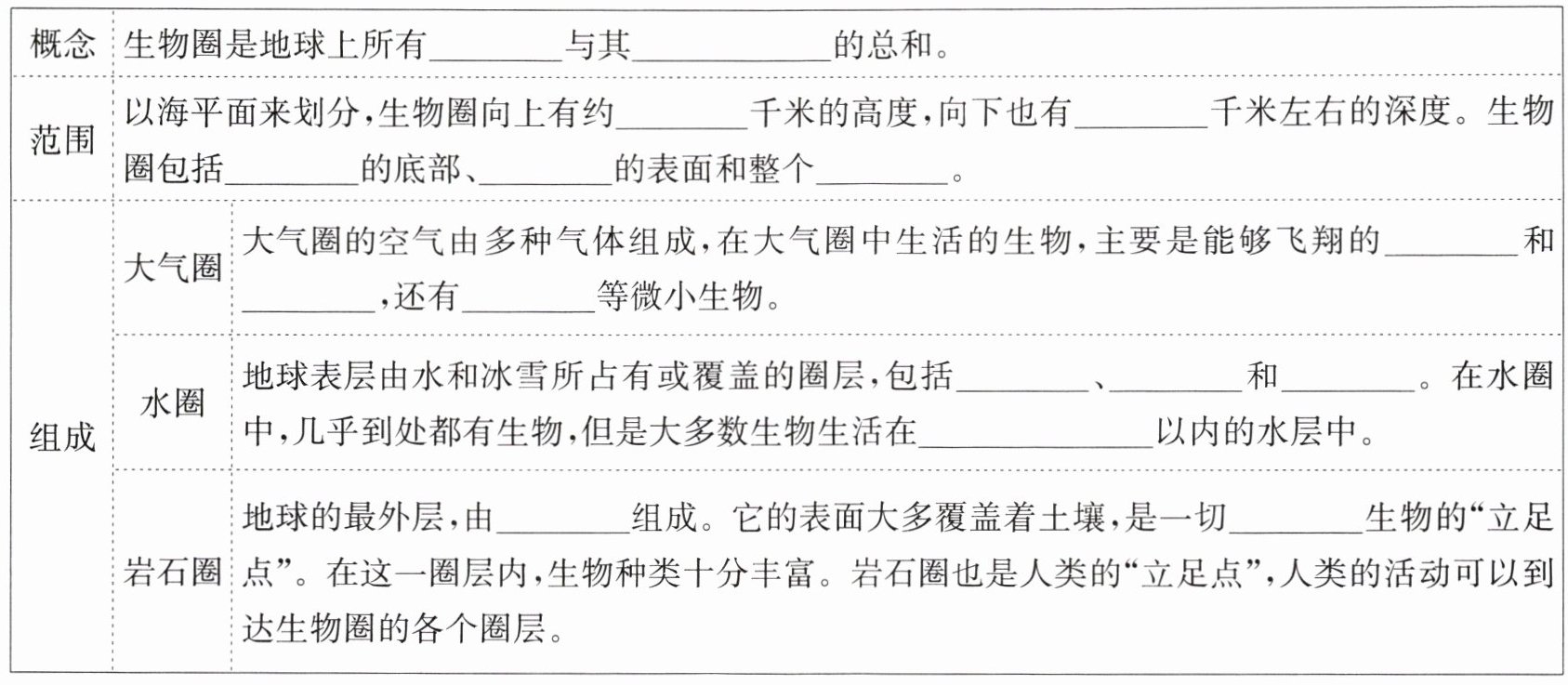 生物 生存环境 10 10 大气圈 岩石圈 水圈 昆虫 鸟类 细菌 大气水 地表水 地下水 距海平面150米 岩石 陆生