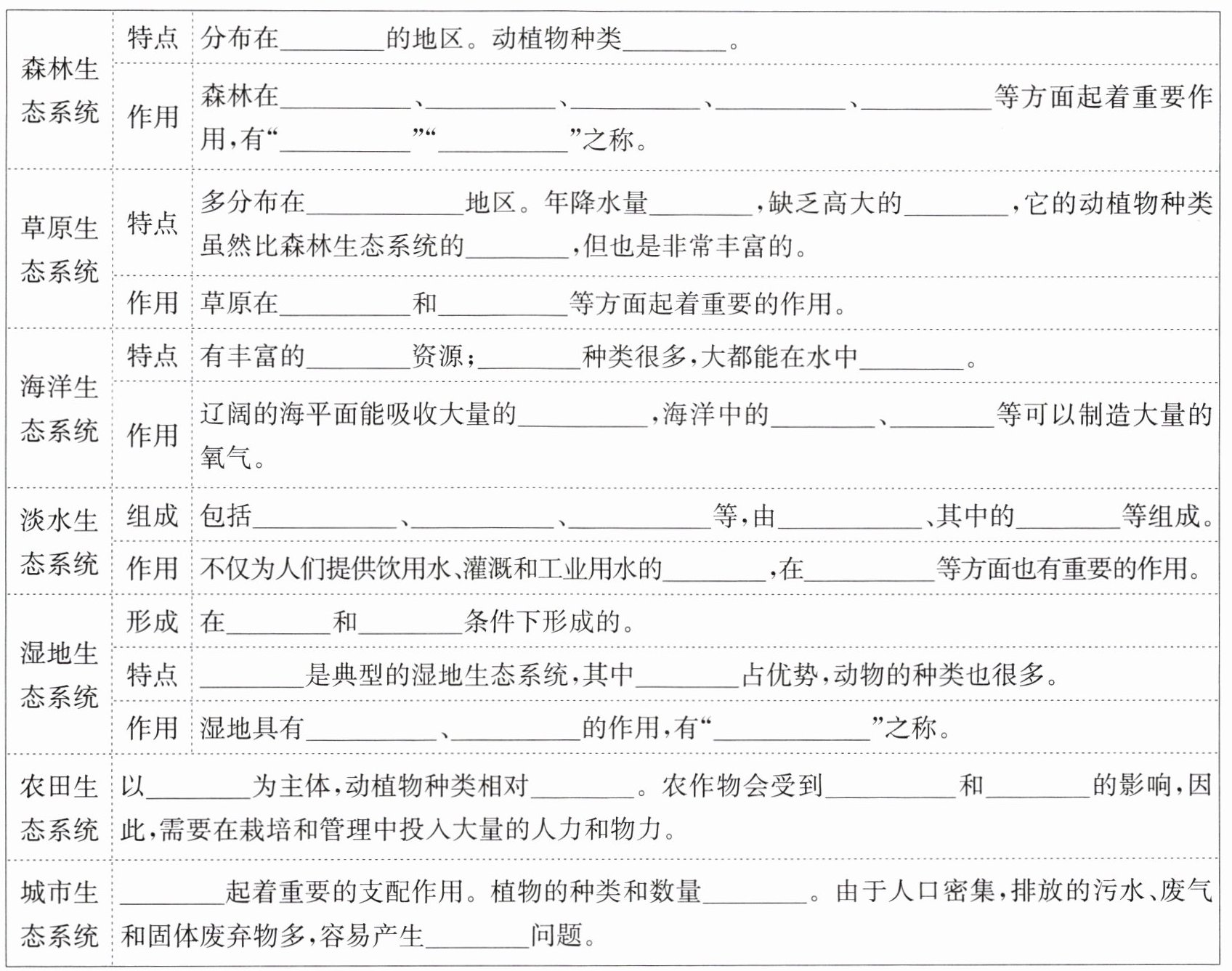 较湿润 繁多 涵养水源 保持水土 防风固沙 调节气候 净化空气 绿色水库 地球之肺 干旱与半干旱 较少 植物 少 保持水土 防风固沙 藻类 动物 游动 二氧化碳 藻类 植物 河流生态系统 湖泊生态系统 池塘生态系统 淡水水体 生物 水源 调节气候 多水 过湿 沼泽 沼泽植物 净化水质 蓄洪抗旱 地球之肾 农作物 较少 旱涝灾害 病虫害 人类 少 环境