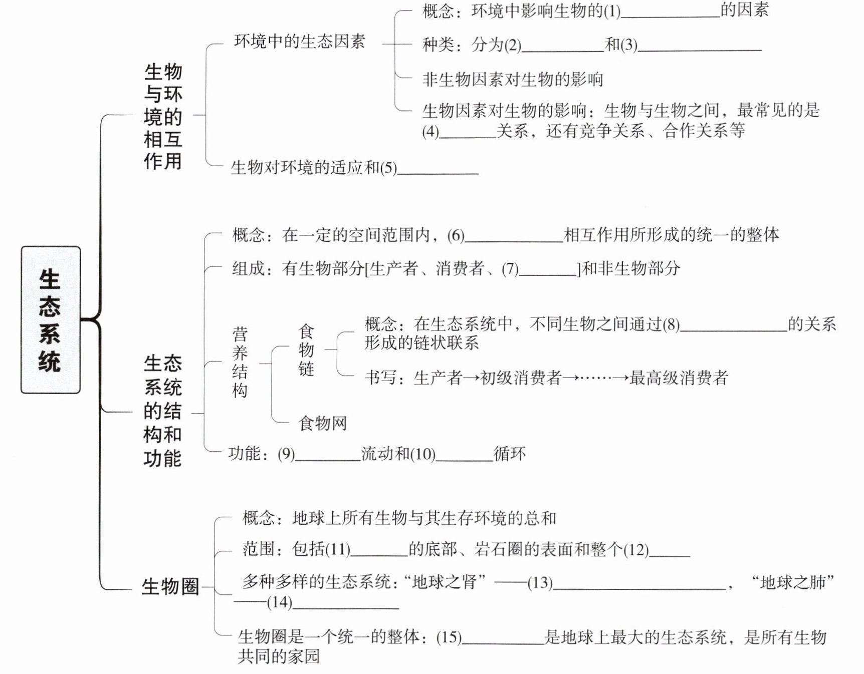 1.D [解析]“苦寒坏我千竿绿,好雨还催众笋长”体现了环境中的温度、水分对生物的影响。“蚯蚓的活动增加土壤肥力”“野兔泛滥加速草场退化”“某些单细胞生物大量繁殖形成赤潮”均体现了生物对环境的影响;“全球变暖导致珊瑚虫死亡”体现了环境中的温度对生物的影响。
