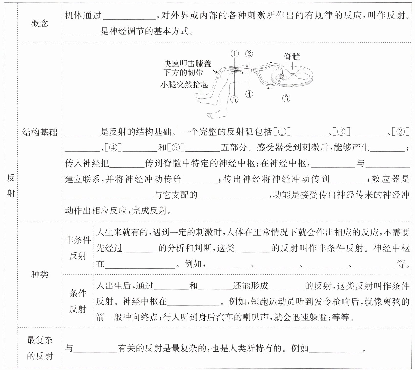 组成,它接收到指令后做出反应。4. 反射分为简单反射和复杂反射。简单反射是人生来就有的反射,其神经中枢位于
