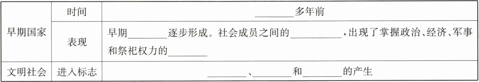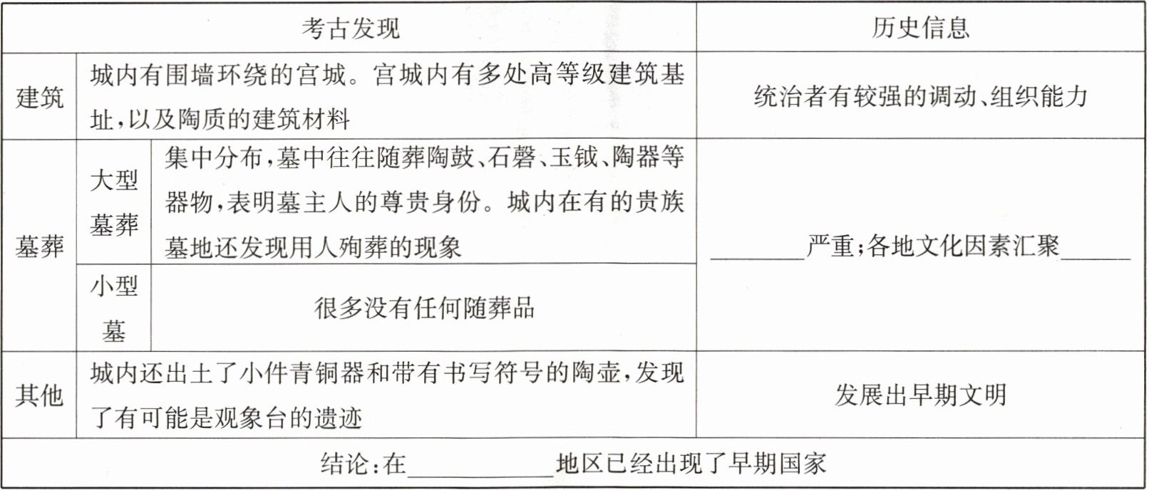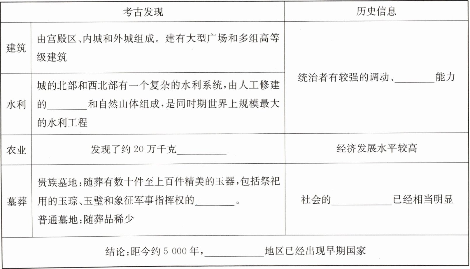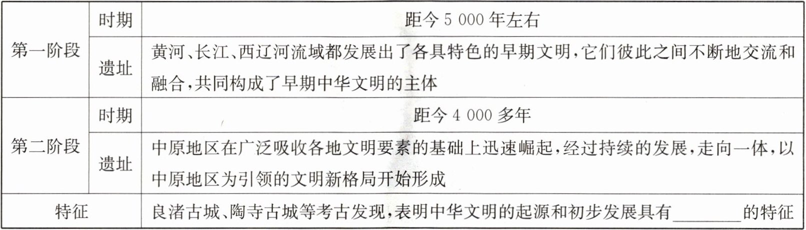 1.(1)水坝 组织 炭化稻谷 玉钺 阶级分化 长江下游(2)阶级分化 中原 黄河中游 2. 多元一体