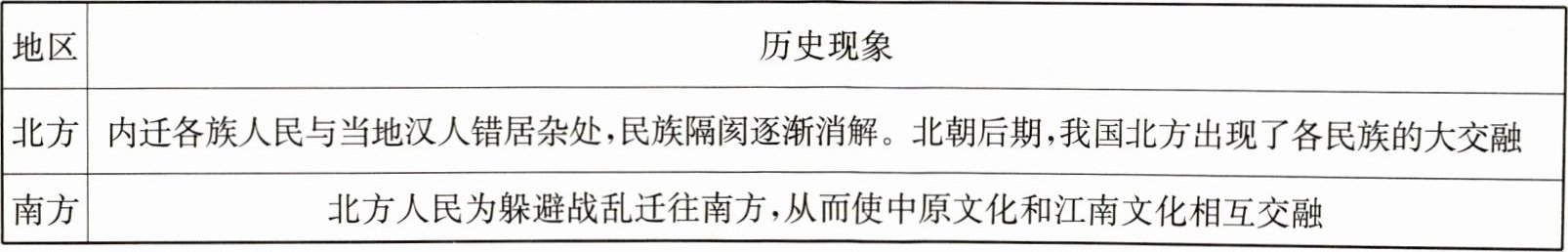 D 解析:根据题干“北朝后期,我国北方出现了各民族的大交融”“北方人民……使中原文化和江南文化相互交融”并结合所学知识可知,魏晋南北朝时期,北方各族内迁和北方人民南迁有利于减少民族隔阂,促进民族交融,为国家的统一创造了条件。