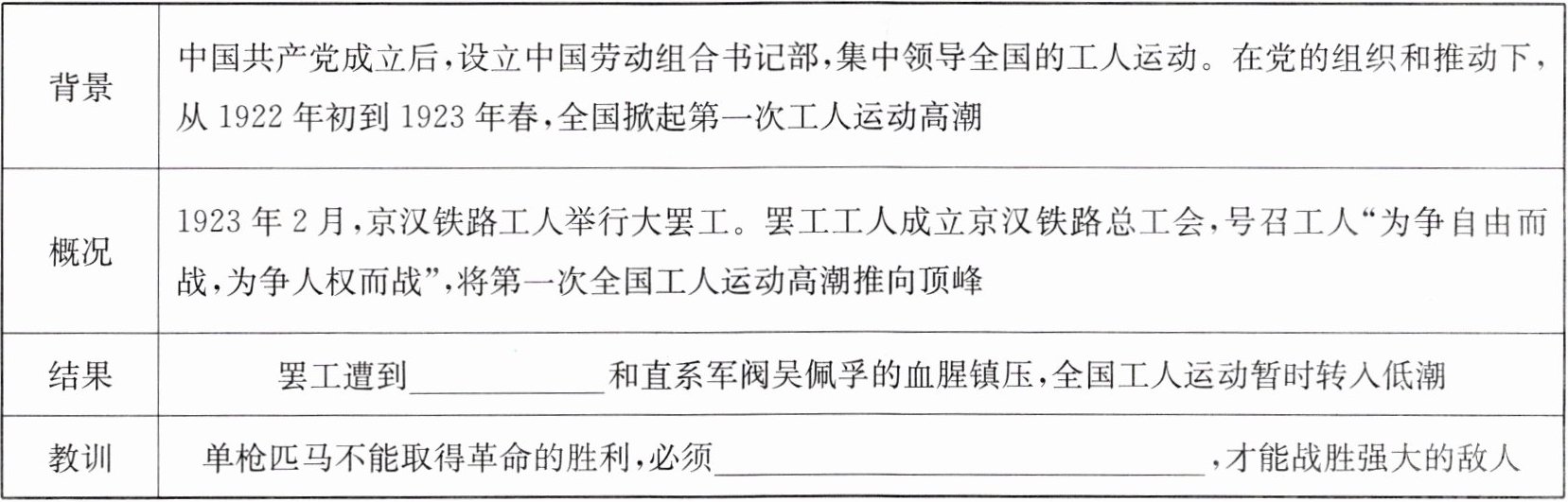 和直系军阀吴佩孚的血腥镇压,全国工人运动暂时转入低潮||教训|单枪匹马不能取得革命的胜利,必须