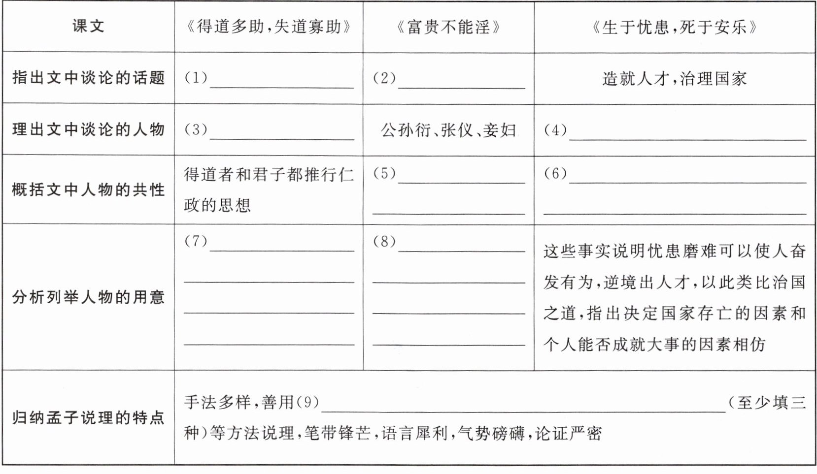 (1)施行仁政(得道)的重要性;(2)大丈夫的标准;(3)得道者、失道者;(4)舜、傅说、胶鬲、管夷吾、孙叔敖、百里奚;(5)以顺从为准则(妾妇之道);(6)出身贫贱,历经磨难,终成大业;(7)通过对比得道者与失道者的结果,论证施行仁政是治国根本;(8)通过批判公孙衍等人的妾妇之道,论证大丈夫标准;(9)举例论证、对比论证、排比