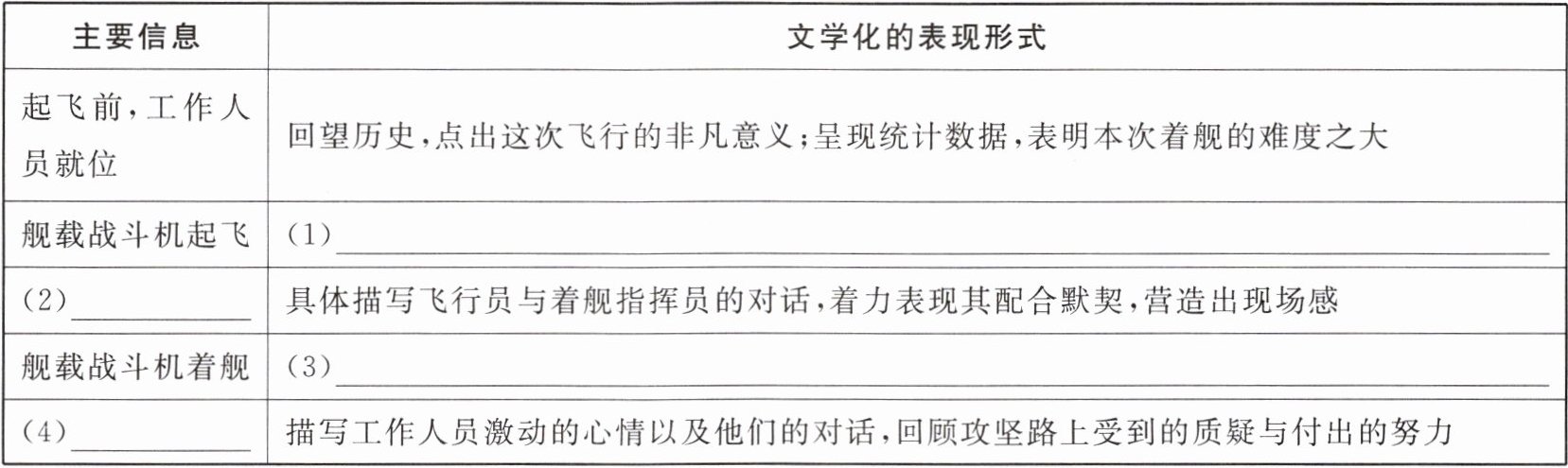 小语用表格来梳理通讯《一着惊海天——目击我国航母舰载战斗机首架次成功着舰》的主要信息及文学化的表现形式,请你帮他一起完成。
