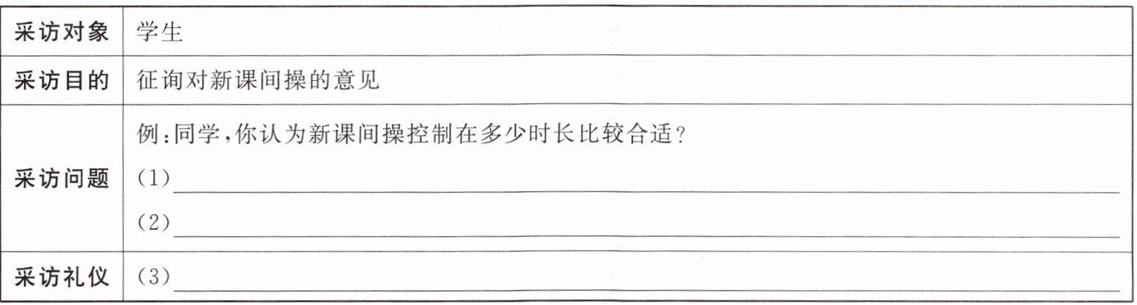 2. 学校将编排新的课间操,想要征询同学们的意见,作为校园小记者,请你设计两个采访问题,并拟写一条关于采访礼仪的建议。