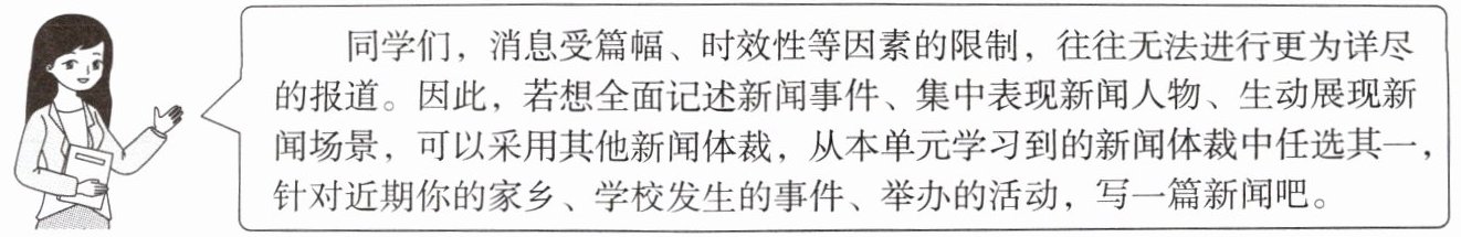 同学们,消息受篇幅、时效性等因素的限制,往往无法进行更为详尽的报道。因此,若想全面记述新闻事件、集中表现新闻人物、生动展现新闻场景,可以采用其他新闻体裁,从本单元学习到的新闻体裁中任选其一,针对近期你的家乡、学校发生的事件、举办的活动,写一篇新闻吧。